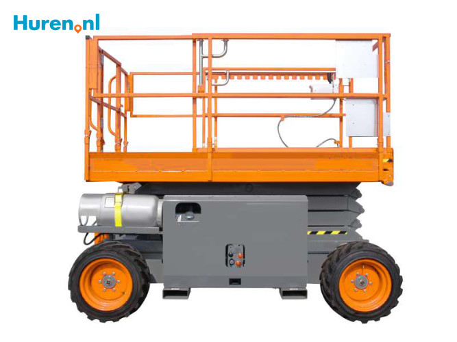 Een schaarhoogwerker die op diesel rijdt is te huur met vier wielen en vierwielaandrijving, maar je kunt er ook voor kiezen om een schaarhoogwerker op diesel te huren met rupsbanden. Vooral op erg ruwe of losse ondergrond een ideale oplossing. Een schaarhoogwerker biedt een relatief groot platform waar vanuit de werkzaamheden te verrichten zijn. In veel gevallen is dit platform uitschuifbaar, waardoor de hoogwerker een groot werkplatform kan bieden. Er zijn schaarhoogwerkers in verschillende groottes, bereik en maximale werklast te huur. Bereken van te voren hoe hoog de schaarhoogwerker moet komen. De maximale werkhoogte varieert van 9.7 tot meer dan 30 meter hoog. Bedenk ook wat de maximale werklast moet zijn. Deze varieert van 400 tot 1.400 kilogram.