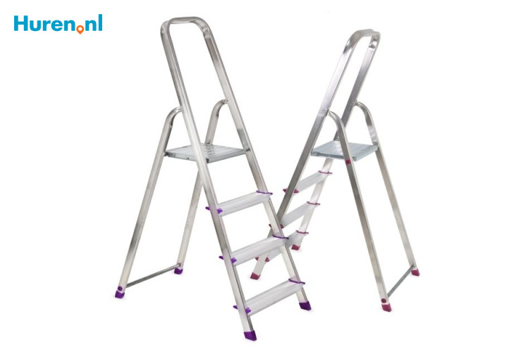 De trapladder is een kleinere trap die je kunt huren via Huren.nl. Vaak is de trapladder of magazijntrap gemaakt van aluminium en is deze stevig doordat hij op vier poten kan staan. Bovenaan de ladder zit vaak een steunbeugel bevestigd zodat je extra steun hebt. Het plateautje bovenaan de magazijntrap kun je eventueel gebruiken om kleinere materialen, zoals een verfkwast, schuurpapier of een emmer op te zetten. Deze hoef je dan zelf niet meer vast te houden, zodat je beide handen vrij hebt voor het karweitje dat je wilt gaan doen.